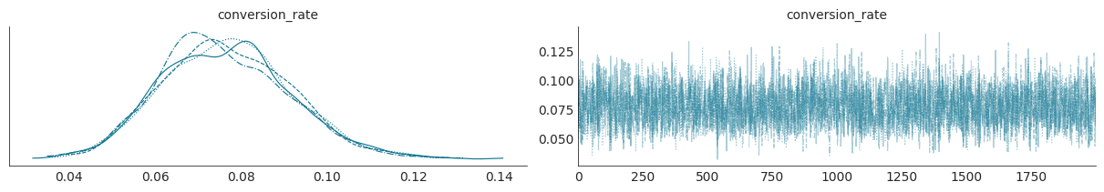 ESS bulk and ESS tail (3966.0 and 5559.0, Goal Achieved): Both effective sample sizes are significantly greater than the ≥400 minimum threshold. This means there are plenty of high-quality, effectively independent samples to accurately estimate the mean, mode, and credible intervals of the true conversion rate.