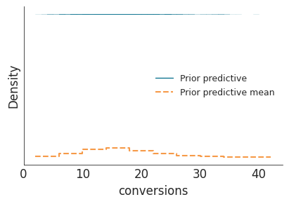 The generated plot from the prior predictive sampling shows the distributions of simulated data (the number of conversions) created by sampling from the \text{Beta}(8,92) prior distribution. - The distribution of the simulated data (prior predictive line) appear broadly spread out and relatively flat across a wide range (0 to 40+ conversions). This indicates that the prior allows for many different outcomes, and thus it is not overly restrictive. - The dashed line represents the average predicted number of conversions It is also quite flat and non-committal. - It evident that the prior predictive distribution does not overly concentrate around any specific number of conversions, which is desirable when we want to remain open to various possible outcomes. - So the prior predictive check confirms that our chosen Beta(8,92) prior is reasonable though it also quite weakly informative how?