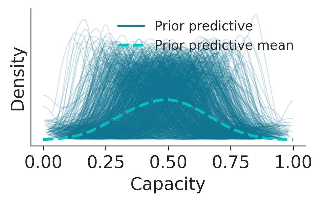 The posterior predictive distribution aligns closely with the observed capacity distribution, indicating that the model successfully captures the underlying data-generating process. In contrast, the prior predictive distribution is smoother and exhibits broader structure, reflecting weaker and less targeted assumptions before observing data.