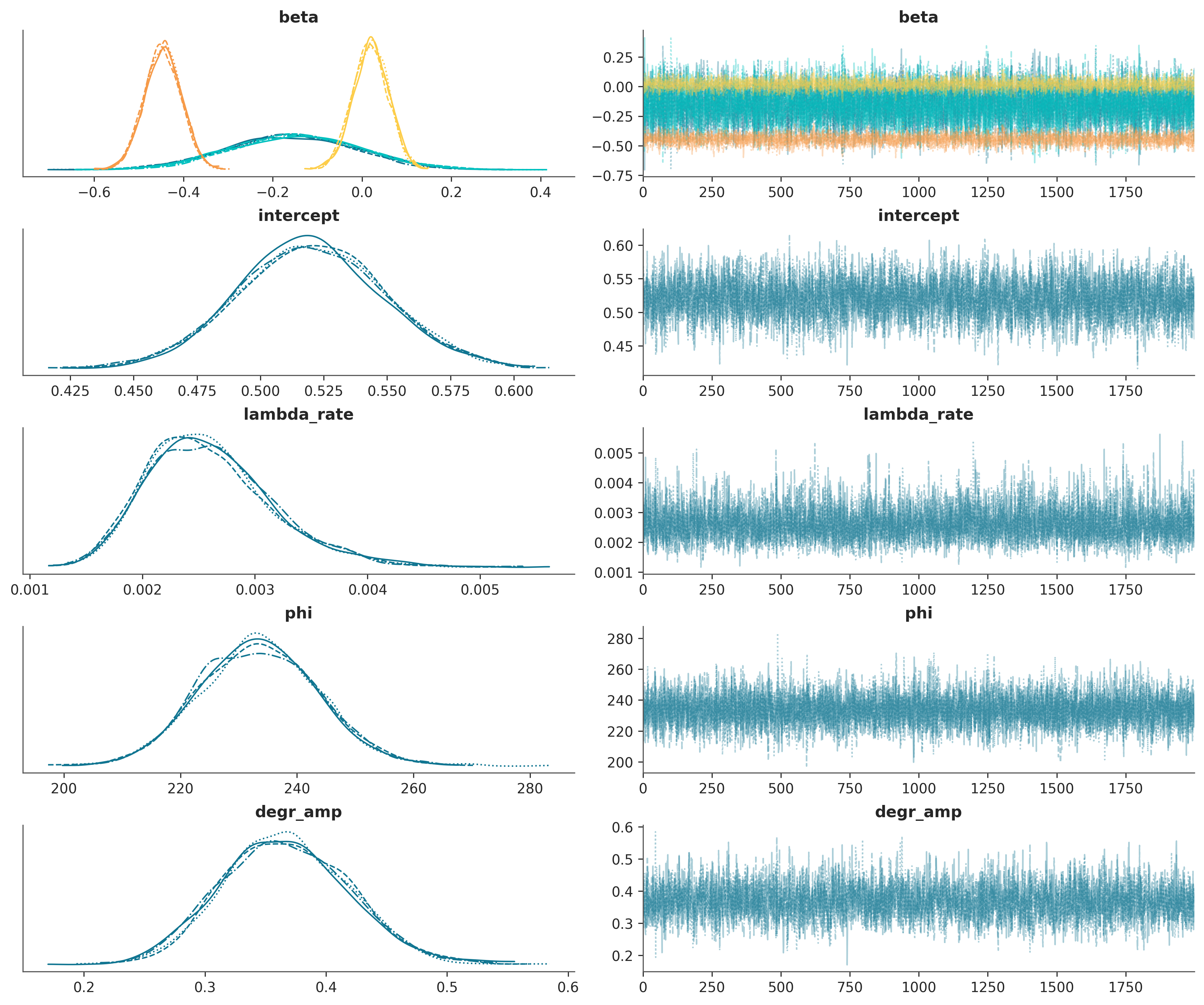 draws=2000: Specifies 2000 final samples kept from the chain. These collected samples form the final Posterior Distribution for every model parameter (\(\lambda\), \(\beta\), \(\phi\)).